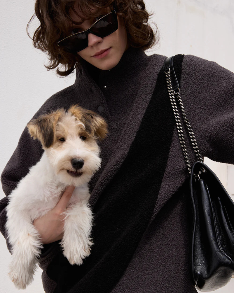 Riikyu's elevated pet-carrier apparel uniquely combines luxe craftsmanship with the comfort of knitwear. It features durable textured fleece outside and a supple faux suede inside, resistant to pets' hair and scratches. Precision stitching ensures robust, neat seams, reflecting their dedication to quality and animal protection.