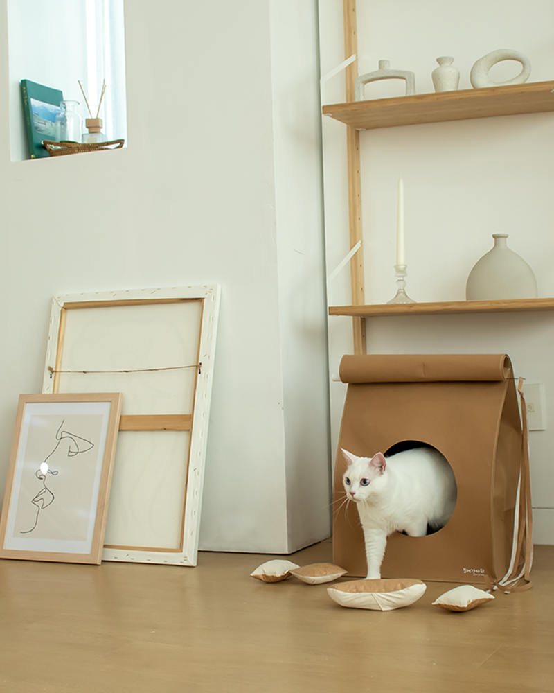 Hide & Seek Bag is perfect for your cat looking for their own space and for you as its simple, clean design made with 100% natural pulp will make your living space pleasant for both of you. Natural pulp is stronger than leather and light as paper. Scratcher and organic catnip included. Catnip toy and pillow featured in the image is sold separately.
